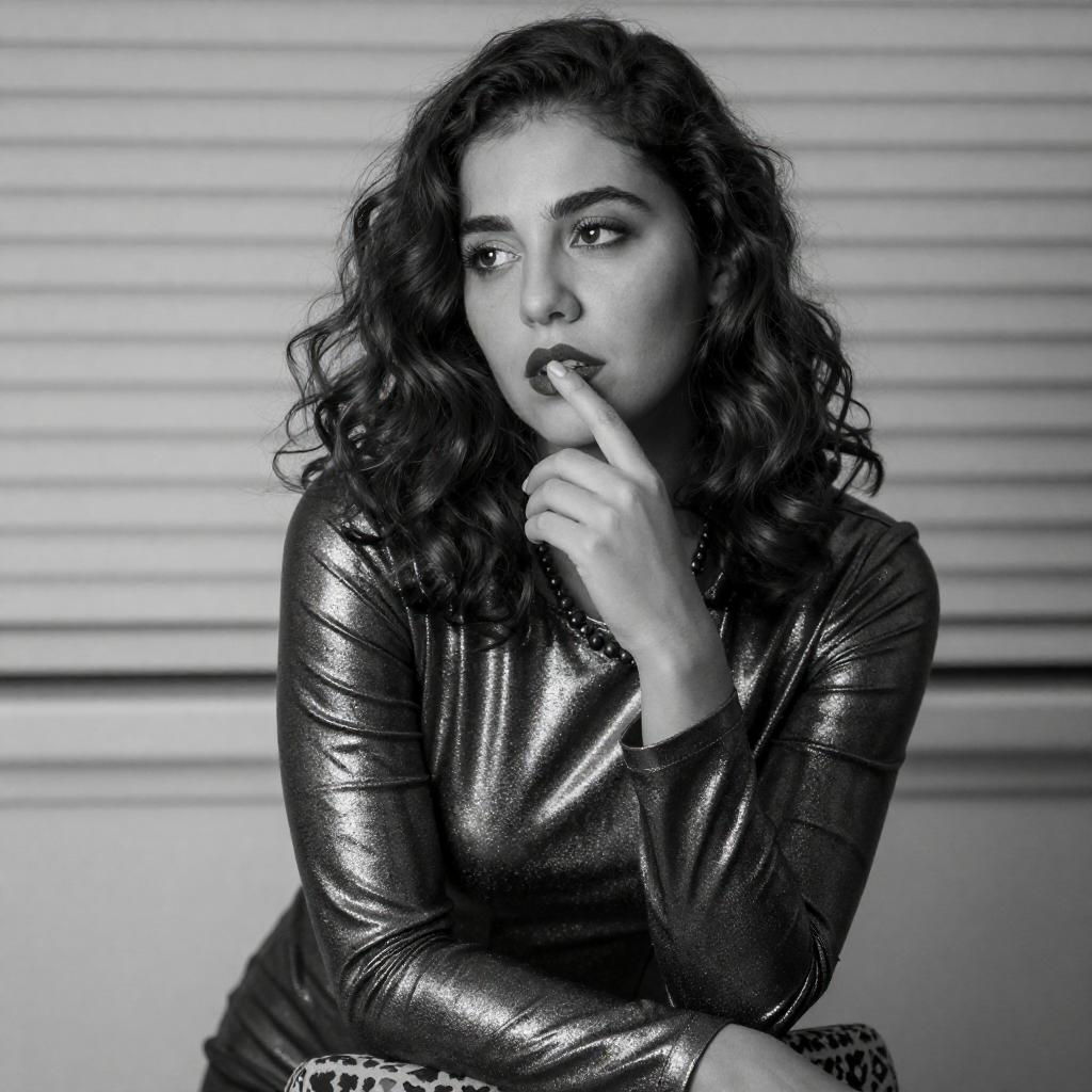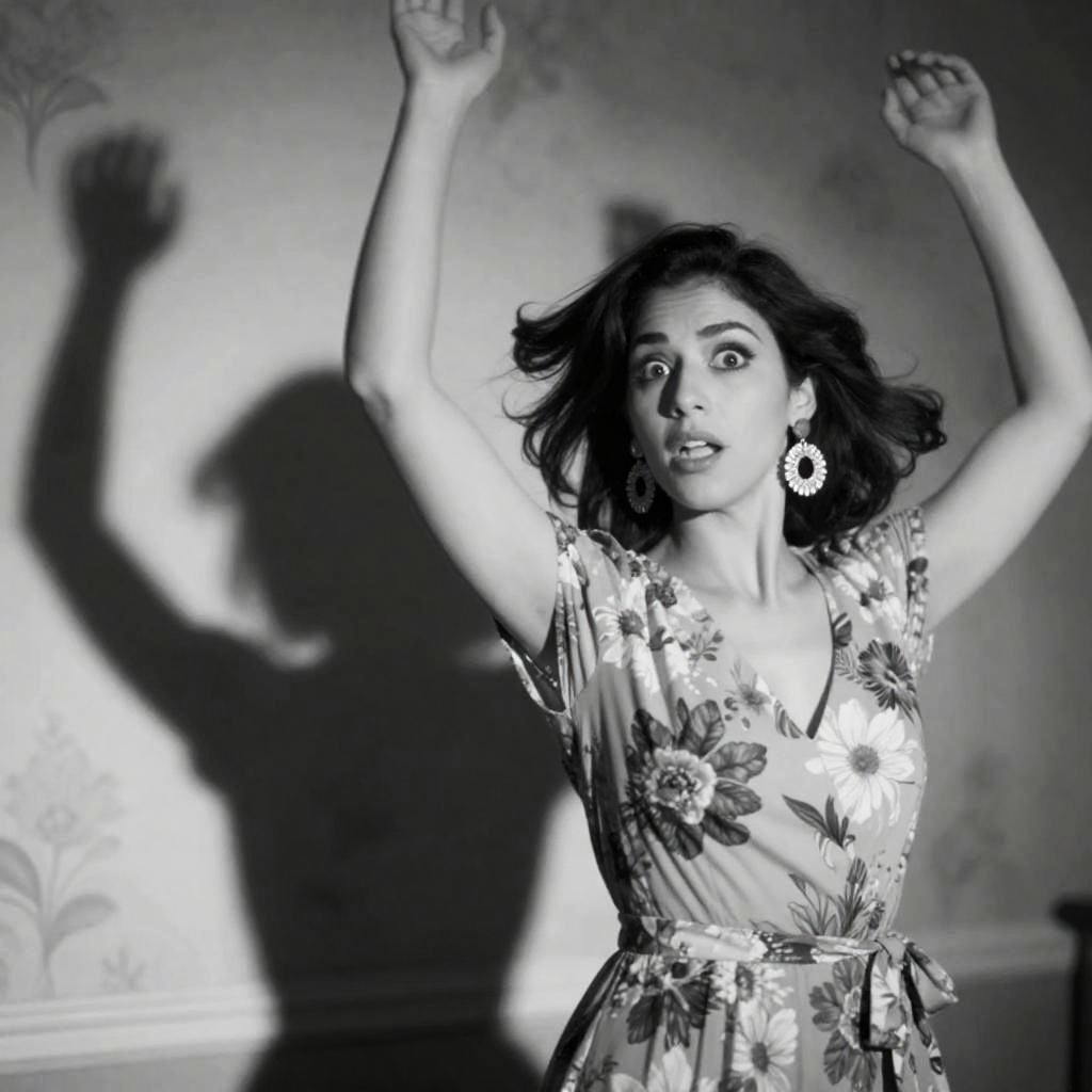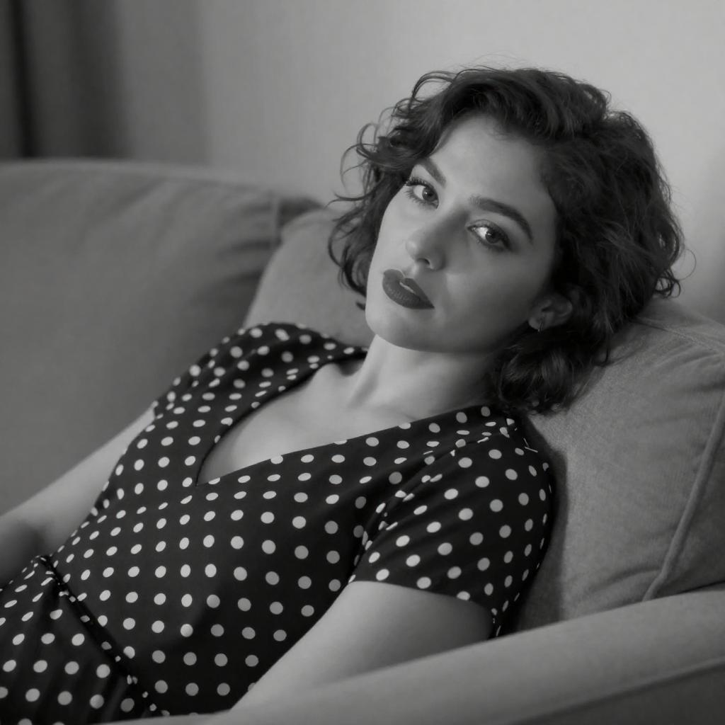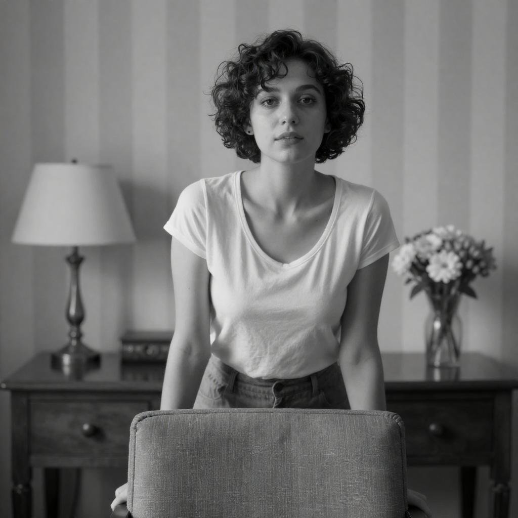 Black-and-white photograph of a woman with curly hair, wearing an off-the-shoulder dress and pearl necklace, leaning forward over a bed. A sailor's nautical wheel is on the wall behind her. She holds a crumpled fabric in her right hand. A suitcase and a hand fan are on the bed. Her expression is intense and focused.