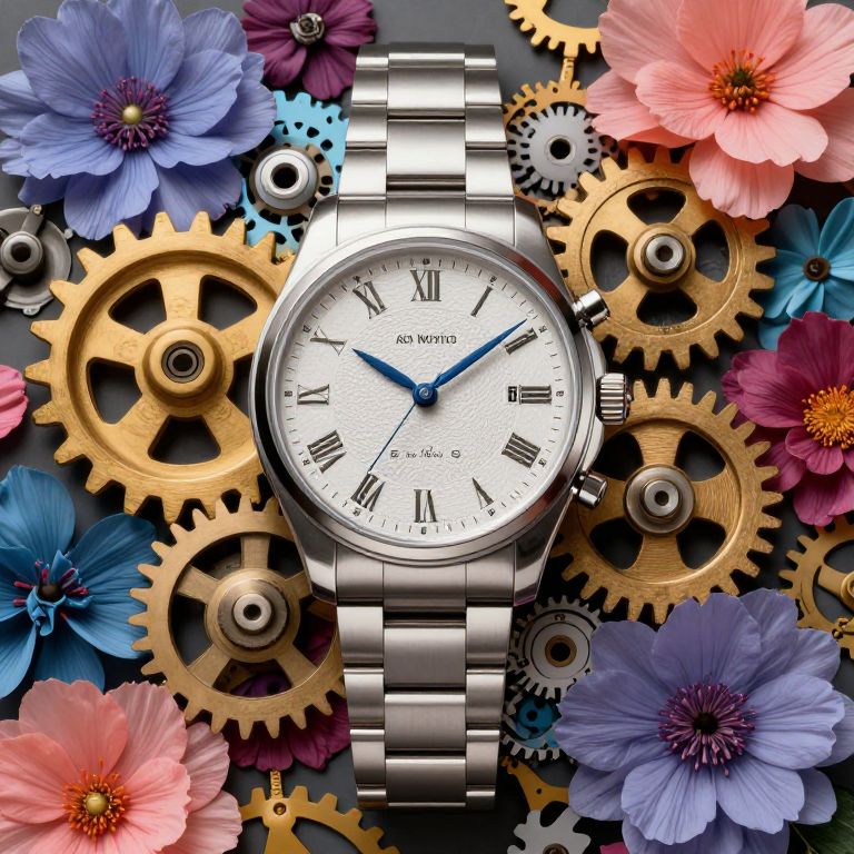 Photograph of a silver wristwatch with blue hands surrounded by vibrant flowers and gold gears on a black background.