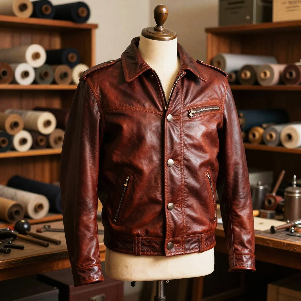 Classic leather jacke displayed on a tailor's mannequin in an old-fashioned workshop, warm tungsten lighting highlighting seams and textures, wooden shelves filled with fabric rolls in the background, vintage tools scattered around, nostalgic and artisan feel, photorealistic style.