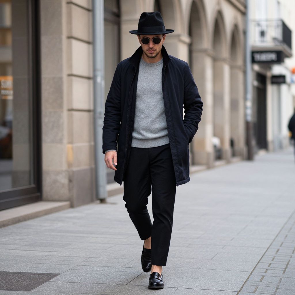 Photograph of a stylish man in a black hat, sunglasses, gray sweater, black coat, black pants, and loafers, walking on a city