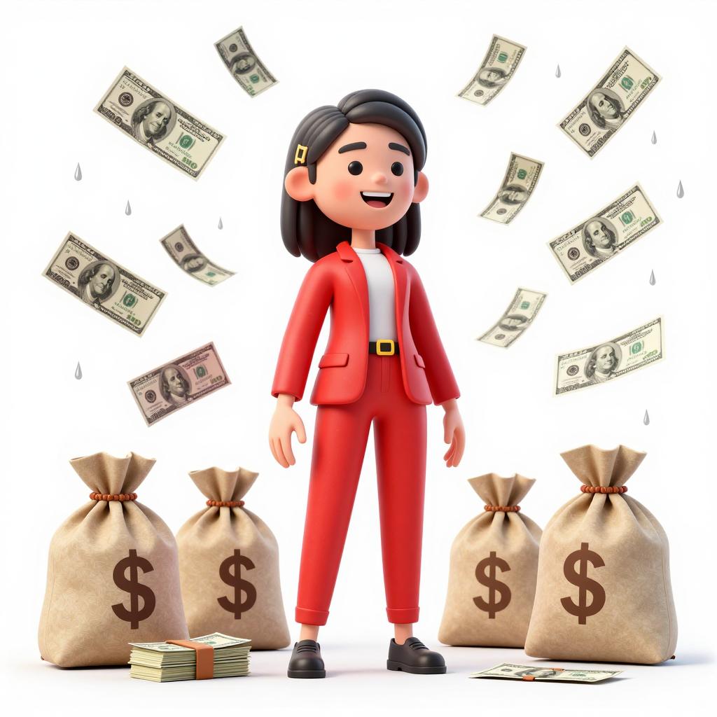 3D illustration of a smiling woman wearing a red suit with black shoes, standing confidently among four large money bags marked with dollar signs, and a stack of US dollar bills. Various US dollar bills float around her in a rain-like effect. The woman has medium-length black hair styled with a clip. The scene symbolizes financial success and wealth.
