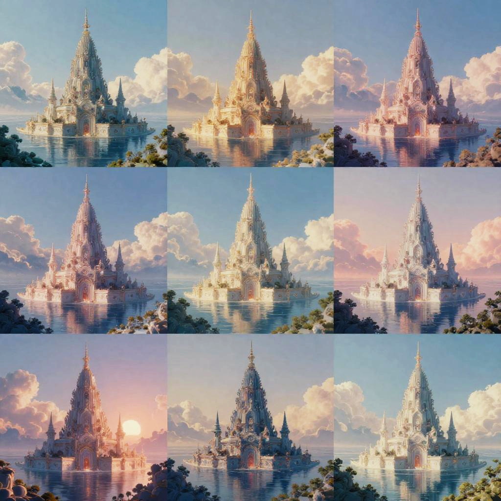 This image is a digital collage of nine photographs showcasing a grand, gothic-style cathedral with multiple spires, set against a backdrop of vibrant, colorful skies. The cathedral, positioned centrally in each frame, reflects on a calm, blue lake surrounded by green trees. The sky transitions from bright blue to warm pink and orange hues, indicating sunrise or sunset. Clouds are fluffy and scattered, adding depth to the sky. The cathedral's intricate architecture is highlighted by sunlight, casting glowing reflections in the water. The image combines elements of realism and fantasy, with a slightly pixelated texture, enhancing its digital art aesthetic.