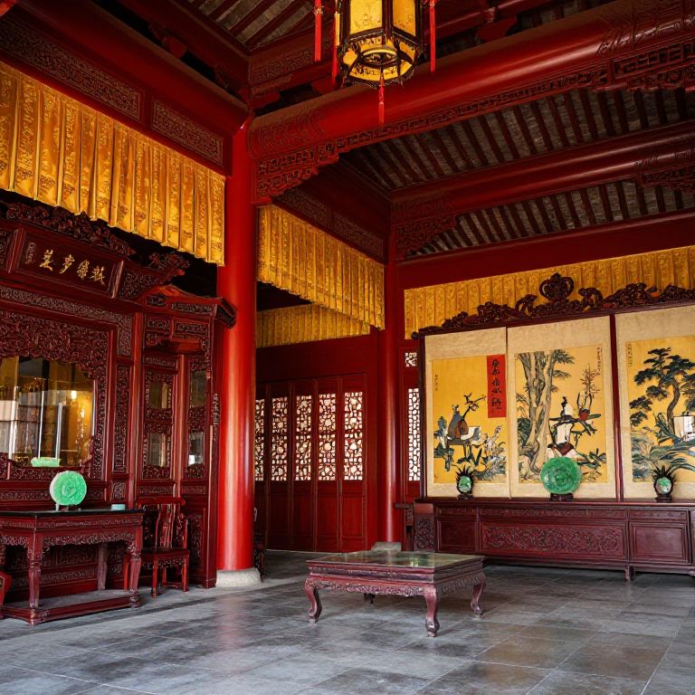 Traditional Chinese interior design showcasing a grand hall with rich red and gold colors, intricate wood carvings, jade decorations, silk wall hangings, and classical Chinese paintings.