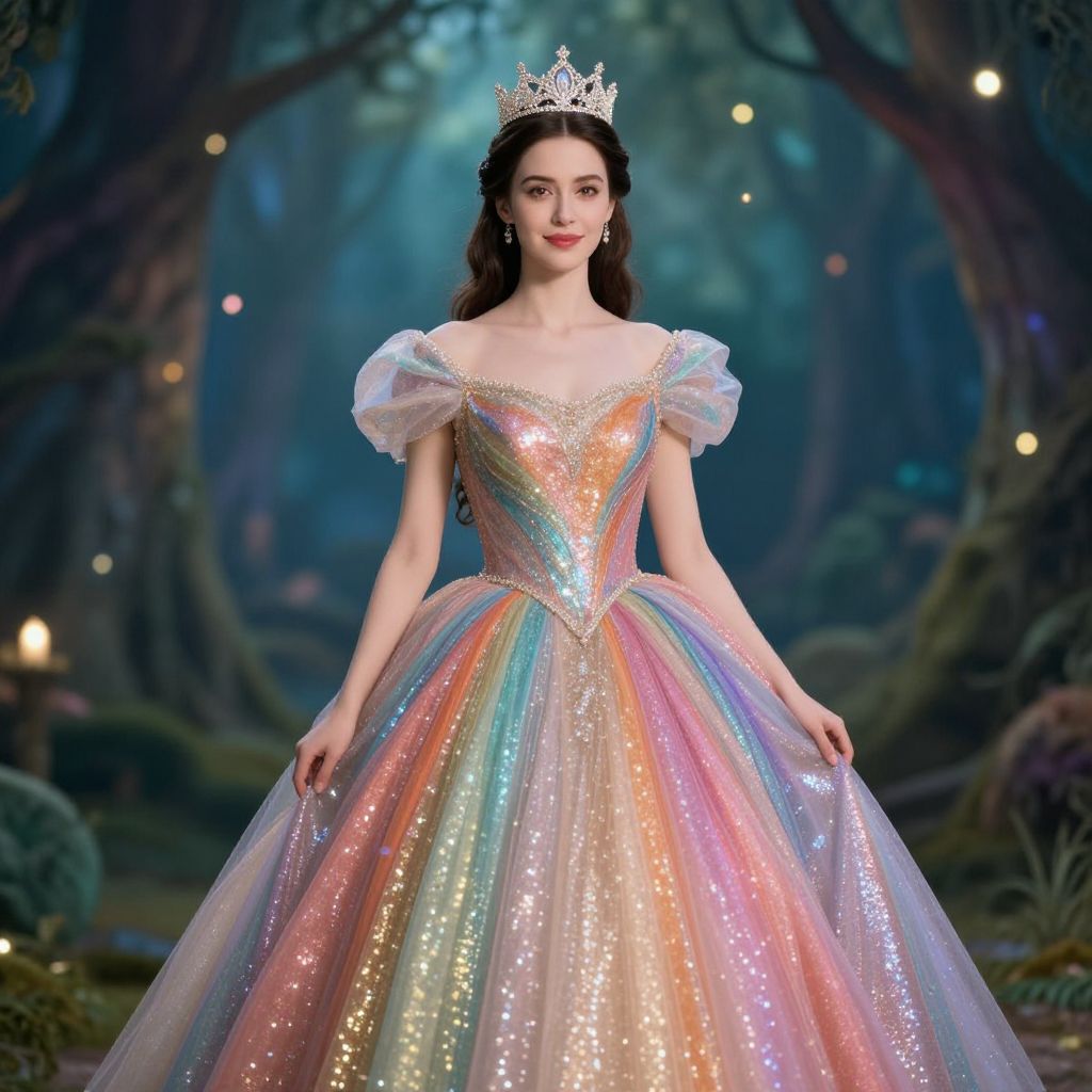 Photograph of a young woman with fair skin and long dark brown hair, standing in a mystical forest. She wears a sparkling, rainbow-colored ball gown with iridescent sequins and a fitted bodice, puffed short sleeves, and a voluminous skirt. A silver tiara with small jewels adorns her head. The background is a blurred, enchanted forest with dark green trees and glowing fairy lights. Her expression is calm and she stands with her hands gently resting on her skirt. The lighting emphasizes the shimmering textures of her dress.