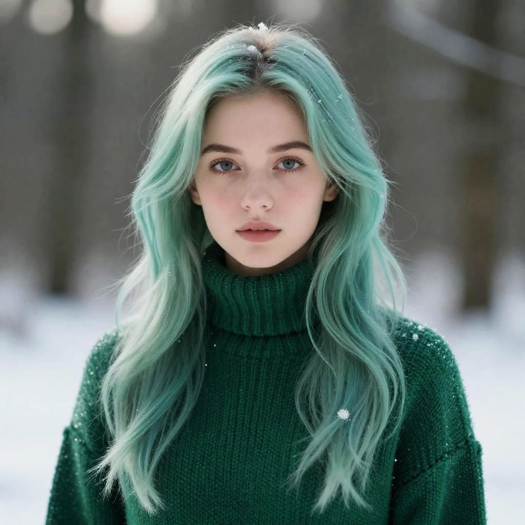 Foxie european girl, mint green to teal gradient hair, knitted emerald green winter sweater, winter forest, Snowflake, natural skin texture, 4k textures, soft cinematic light, photolab, intricate, elegant, highly detailed, sharp focus, ((((cinematic look)))), soothing tones, intricate details, low contrast, exposure blend, hdr, faded, hyperdetailed, backlighting, cowboy shot, 85mm, close-up, sparkle, award winning, best quality, 4K