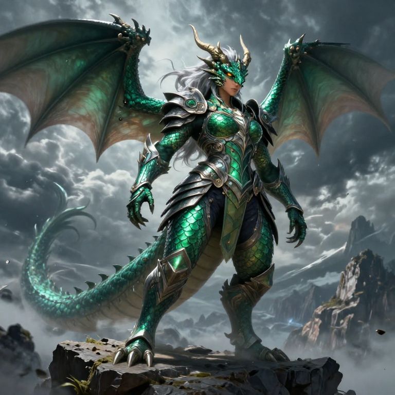 Thick dragon girl standing majestically on a rocky cliff, with shimmering emerald scales, fierce amber eyes, and flowing silver hair, wearing intricate armor, fantasy art style, dynamic lighting, epic background of a stormy sky and distant mountains.