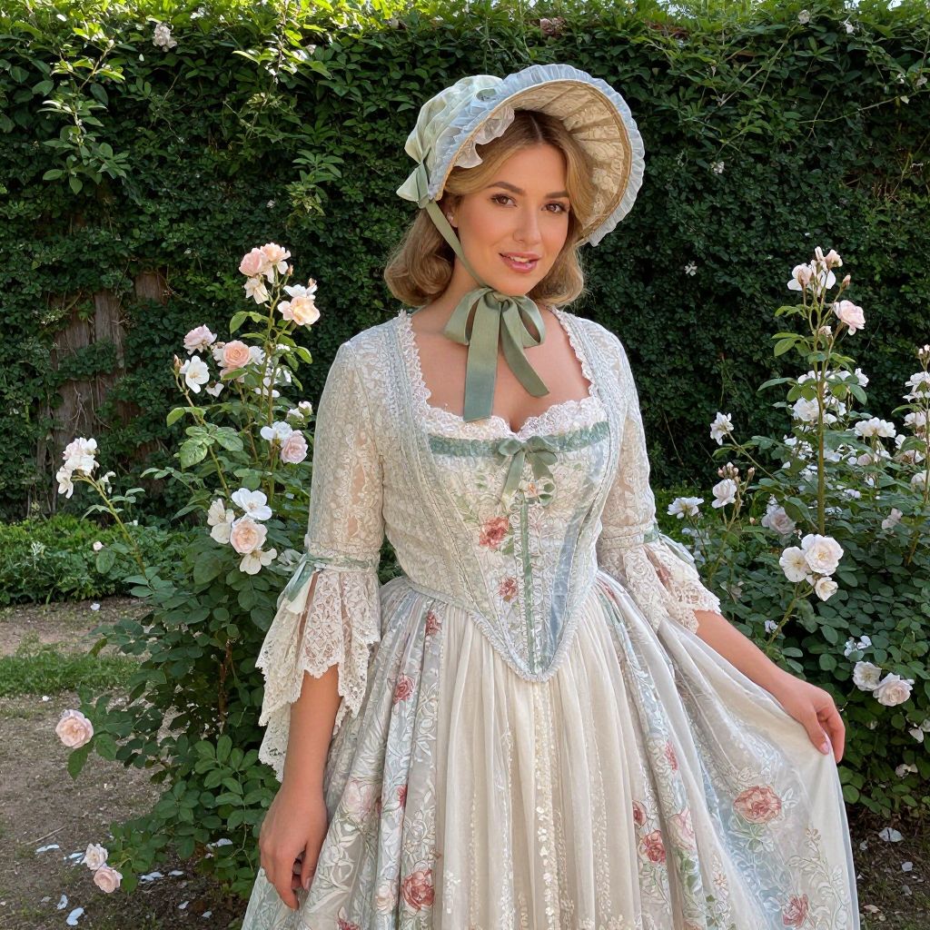 A realistic photograph of a woman with warm brown eyes and soft blonde hair wearing an elegant garden party outfit with floral lace and a long, flowing skirt, standing in a sun-dappled garden with blooming roses and green ivy walls, the costume includes a delicate velvet bodysuit and a satin hat with a green ribbon, setting the scene of a summer evening fête in a European-style estate.. The woman has big tits and cute face