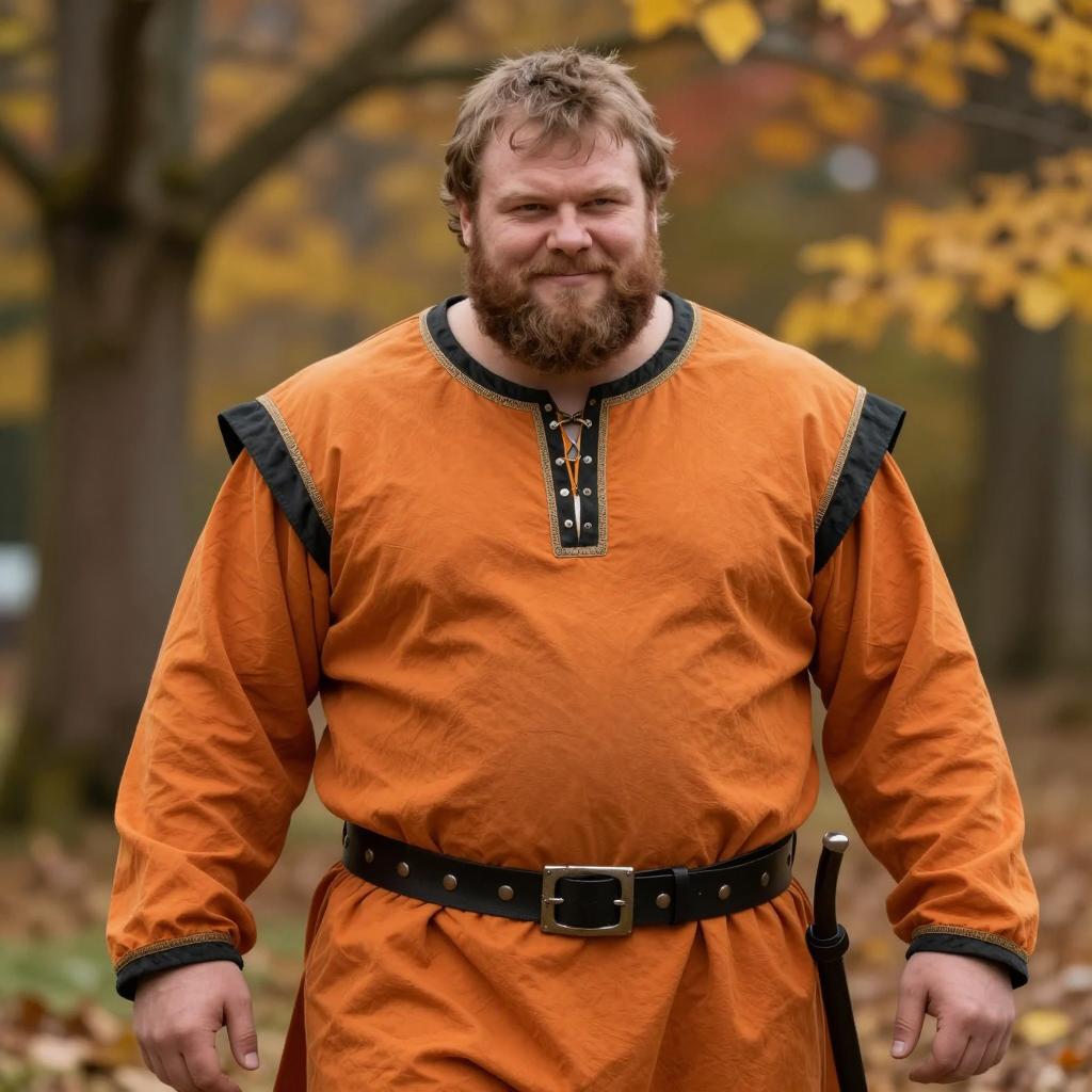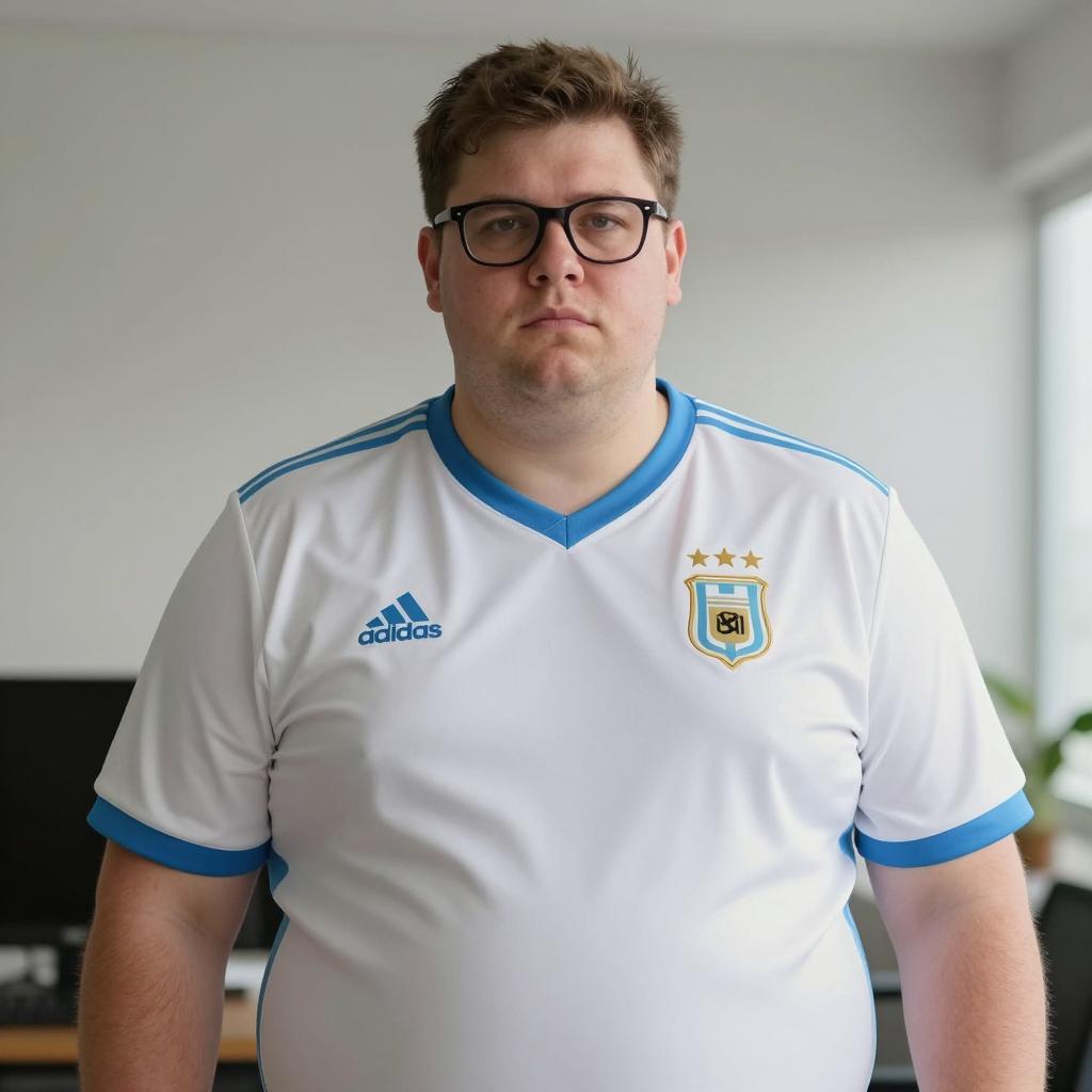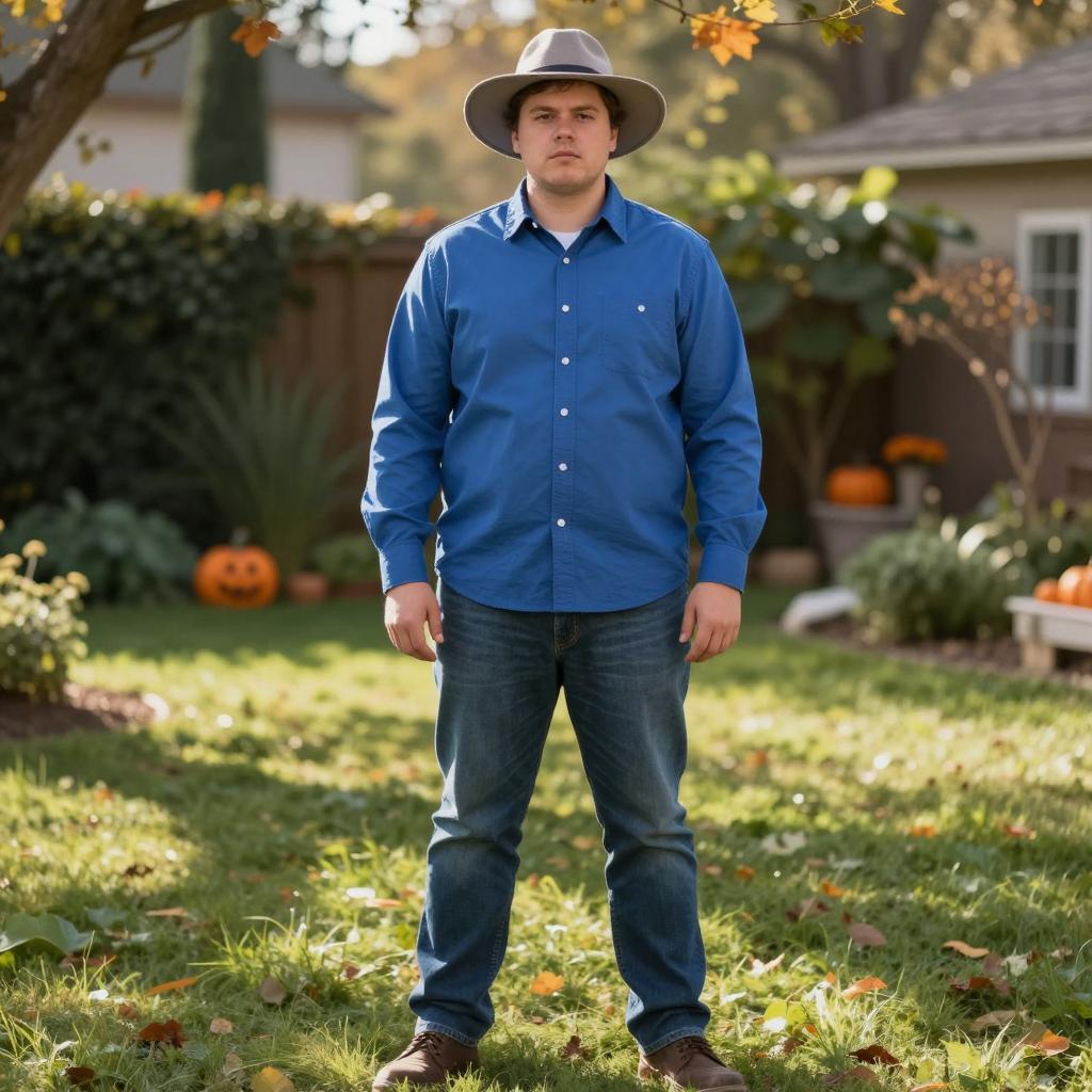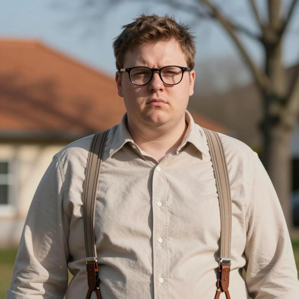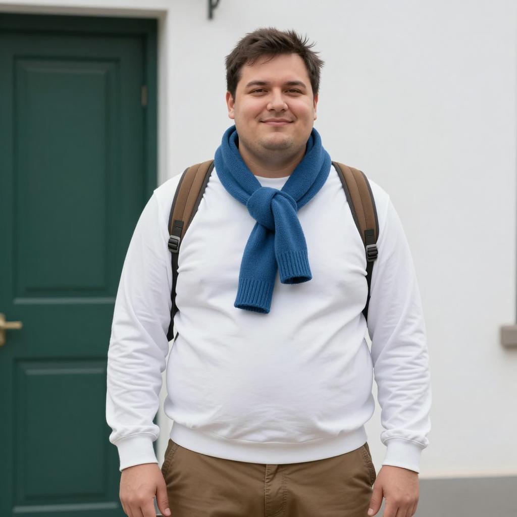 Man plus size classic peter, photograph, overweight man, short brown hair, green short-sleeved shirt with brown buttons, green pants with brown belt, yellow button on shirt, giving thumbs up, slightly squinting eyes, background of outdoor market, people in the background, sunny day, buildings with red-tiled roofs, casual clothing, summer attire, realistic style, daytime, cheerful expression, detailed ures, bright colors