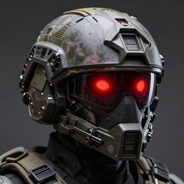 A highly detailed, futuristic military helmet with red glowing eyes and advanced technology features.