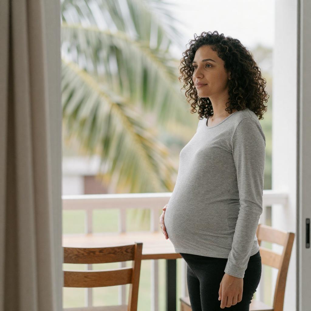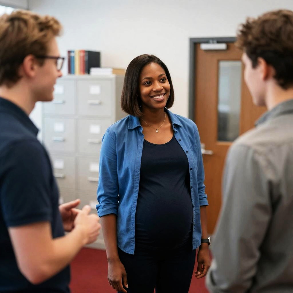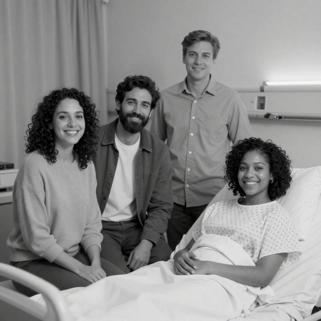 Black and white photograph of four people in a hospital room. A woman with curly hair and a light sweater sits on the left, smiling. A bearded man with dark hair and a jacket sits beside her, smiling. Another man with short hair and a button-up shirt stands behind them, smiling. A woman with curly hair and a hospital gown lies in bed on the right, smiling. A lamp is on the right, and curtains are in the background.