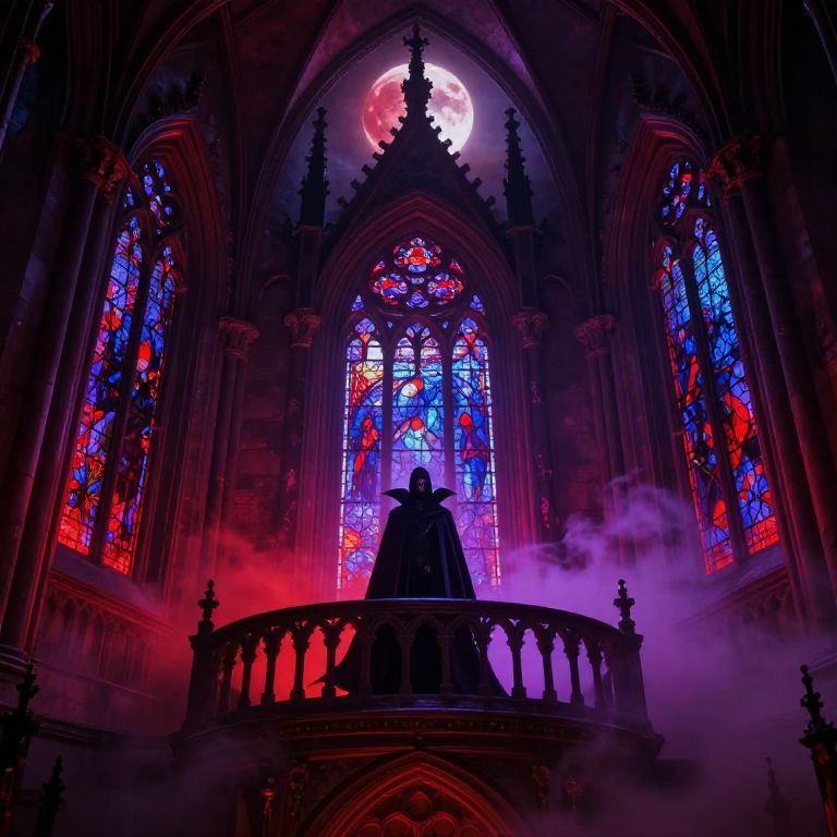 Silhouetted figure in dark cloak standing on Gothic cathedral balcony, backlit by vibrant stained glass and full moon. Purple-red mist surrounds. Phot