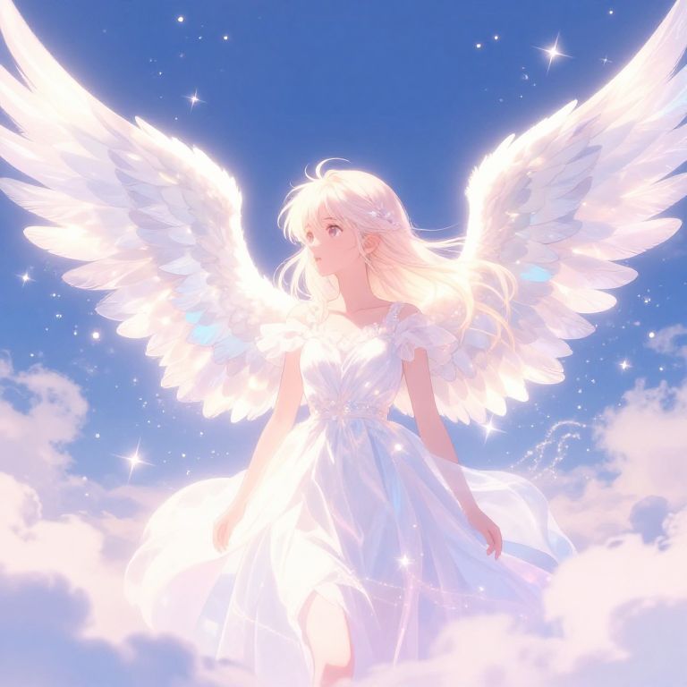 Anime angel wings glowing softly in a celestial sky, detailed feathers shimmering with ethereal light, surrounded by floating sparkles and clouds, character with serene expression and flowing hair, vibrant pastel colors, fantasy art style.