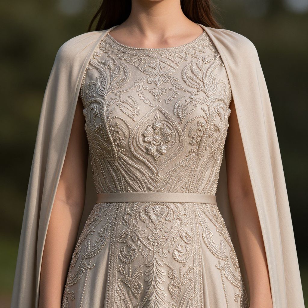 Padme Jubilation Dress, a close up of a woman in a dress with a cape on