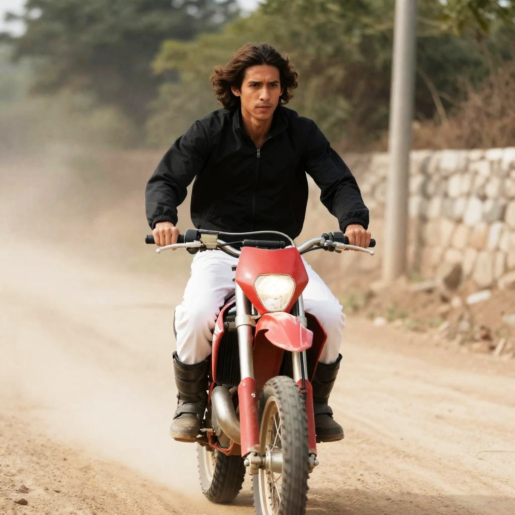Shirtless man with long dark hair rides black motorcycle, wearing sunglasses and blue jeans, with dog headgear on handlebars. Rock pile and greenery in background. Second dog runs alongside, kicking up dust. Daytime, outdoor setting.