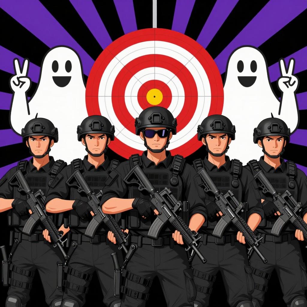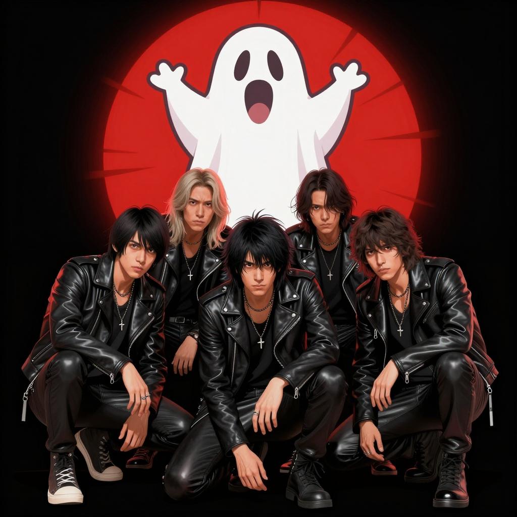 Illustration of four people in dark military-style clothing sitting in a row, facing forward. A white ghost with a smile and three dots for eyes stands behind them, partially obscured by a large red circle. The background is dark with cloudy greenish-blue sky. The ghost has white wings extending outward. The people have focused expressions.