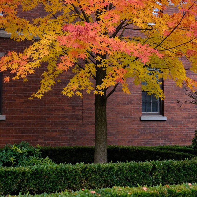Photograph of a vibrant autumn scene featuring a tree with bright orange and yellow leaves in full bloom. The tree stands in front of a red brick building with white window frames. Below, there's a well-trimmed green hedge. The contrast between the colorful leaves and the brick building creates a striking visual. The sunlight filters through the leaves, highlighting their vivid colors. The background is simple, focusing attention on the tree and its autumnal display.