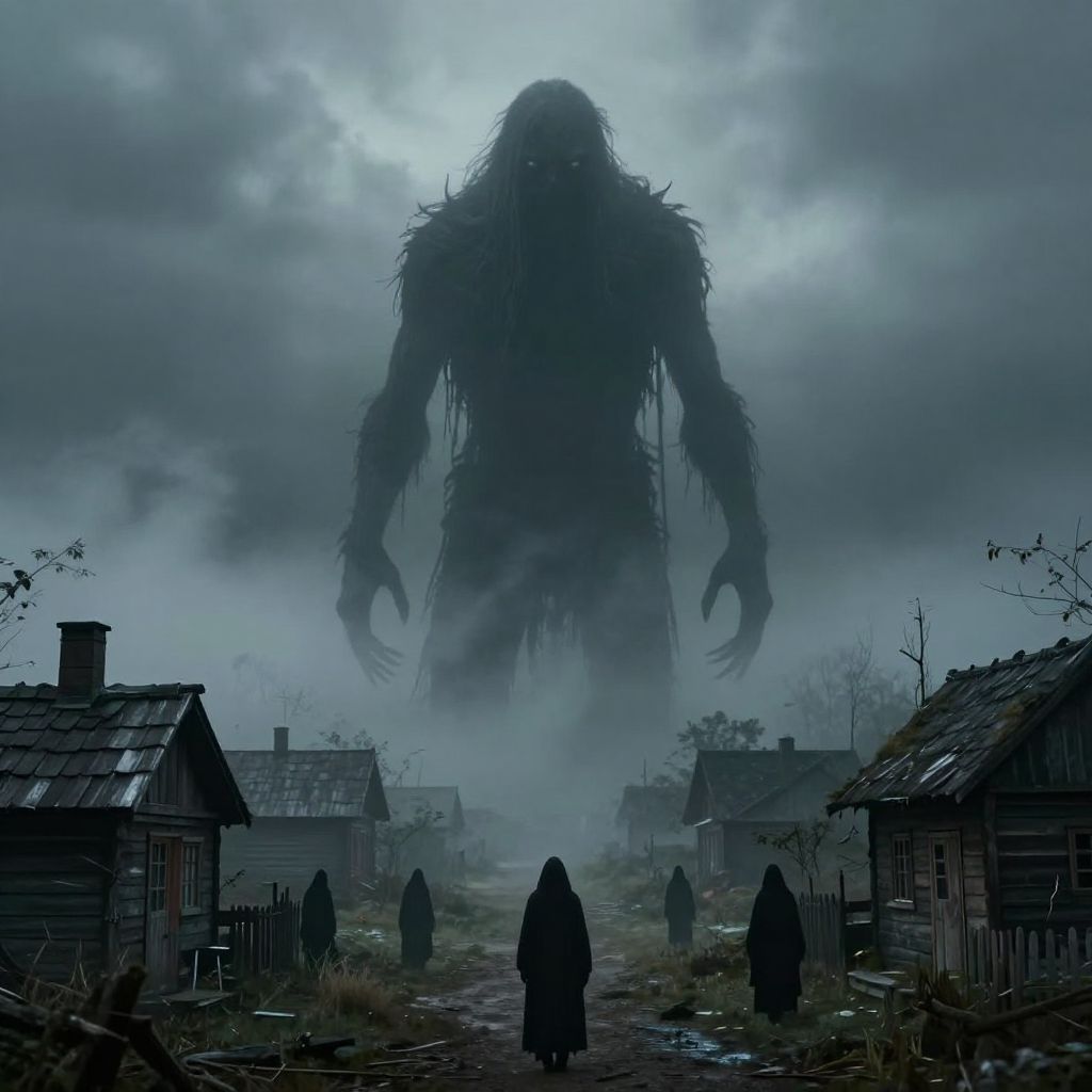 A surreal and eerie scene depicting a giant, shadowy creature with glowing eyes standing in a misty, rural village surrounded by hooded figures and small wooden houses. The atmosphere is dark and foggy, creating a mysterious and ominous mood.