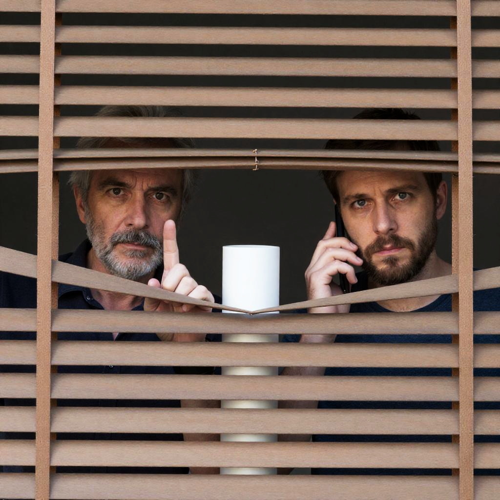 Two men peeking through horizontal wooden blinds. Left man with gray hair, mustache, index finger raised. Right man with brown hair, beard, holding phone to ear. Both serious expressions. White cylindrical object between them. Background is dark.