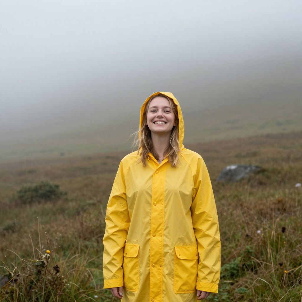 Radiant joy and resilience shine through the misty embrace of nature, as a young woman in a vibrant yellow raincoat stands poised against the backdrop of an ever-changing landscape, her smile a beacon of hope amidst the transient beauty of the world.