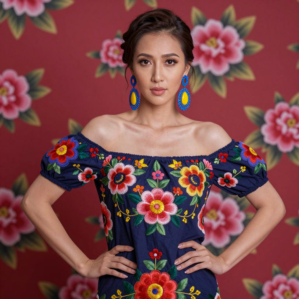 Photorealistic illustration of a woman with a large, colorful, embroidered hat, green, puffy-sleeved dress with vibrant floral patterns, red lipstick, and elaborate silver earrings. Bright pink background. She stands with hands on hips, staring forward with a neutral expression.