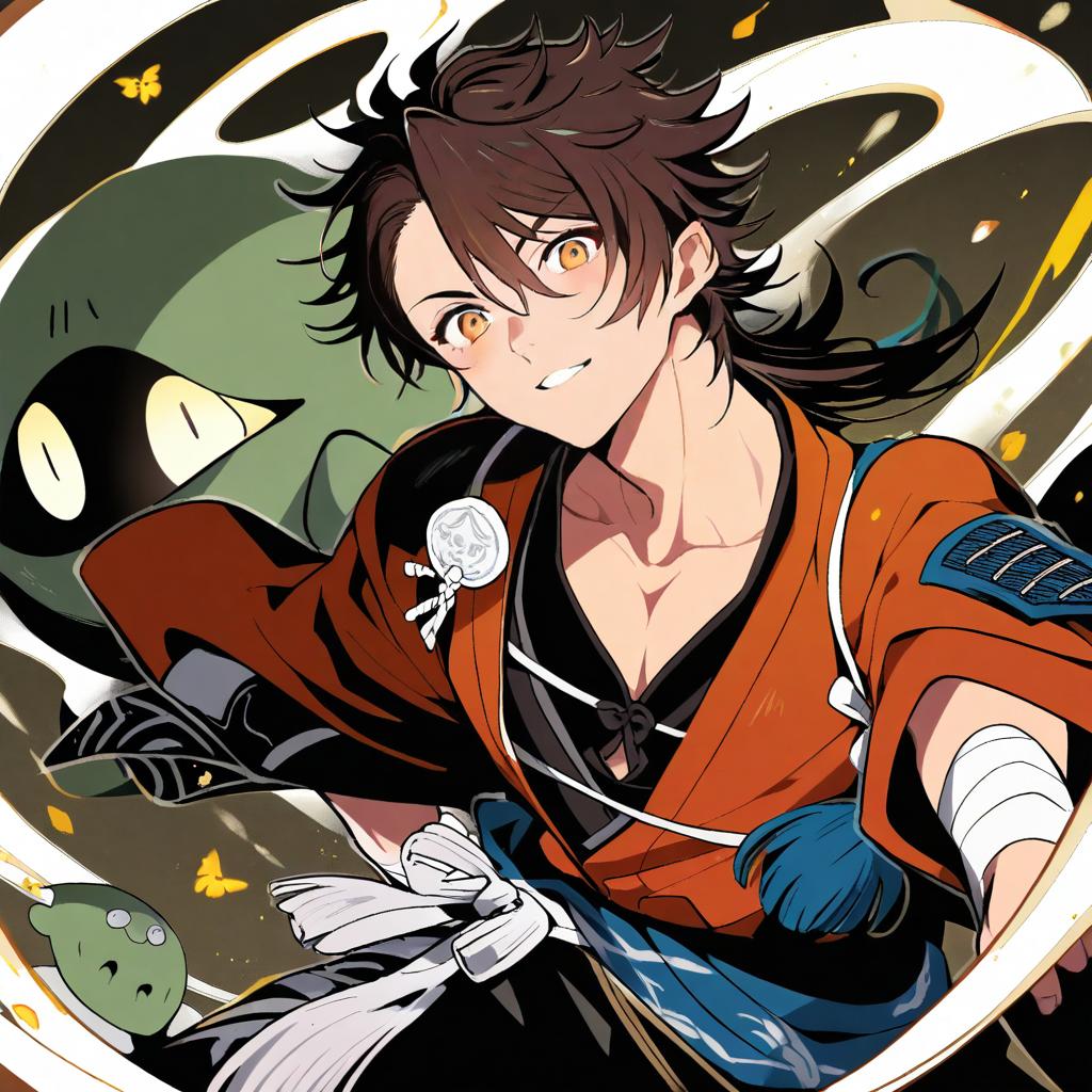 Mutsu-no-kami yoshiyuki, touken ranbu, 1boy, yellow eyes, brown hair, long hair, japanese clothes, japanese clothes, sode, by artist tokita (jyabarachan), animagine