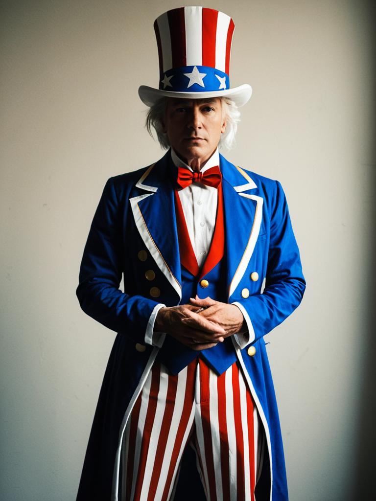 Man cosplay. Wearing Uncle Sam (DC Comics) costume. Realistic photo. Dressed as Uncle Sam (DC Comics) --sref 1400
