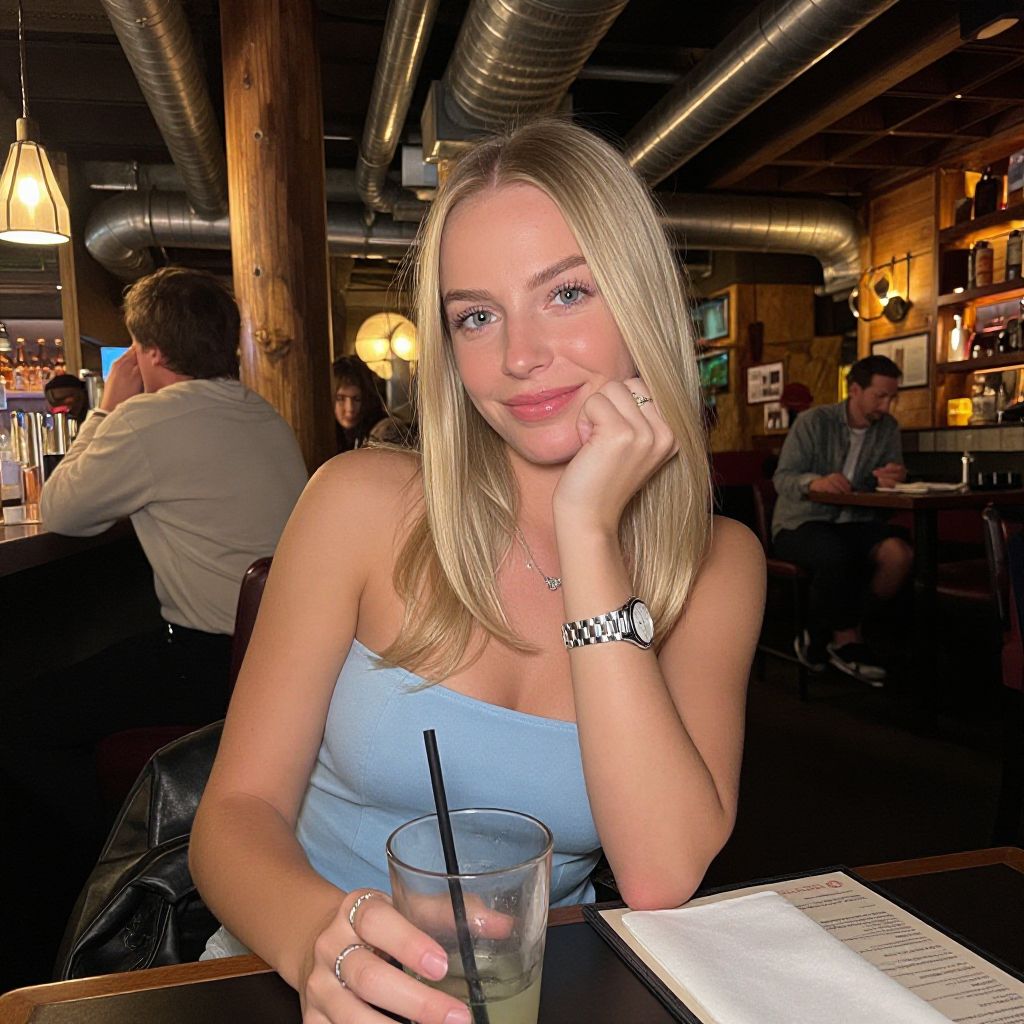 Photograph of a blonde woman with straight hair, wearing a light blue, strapless top and a silver watch, sitting at a dimly lit bar. She's smiling and resting her chin on her hand, holding a glass with a straw. The background shows other patrons and a warm, industrial-style interior with exposed pipes and wooden accents. The table has a menu and a napkin.