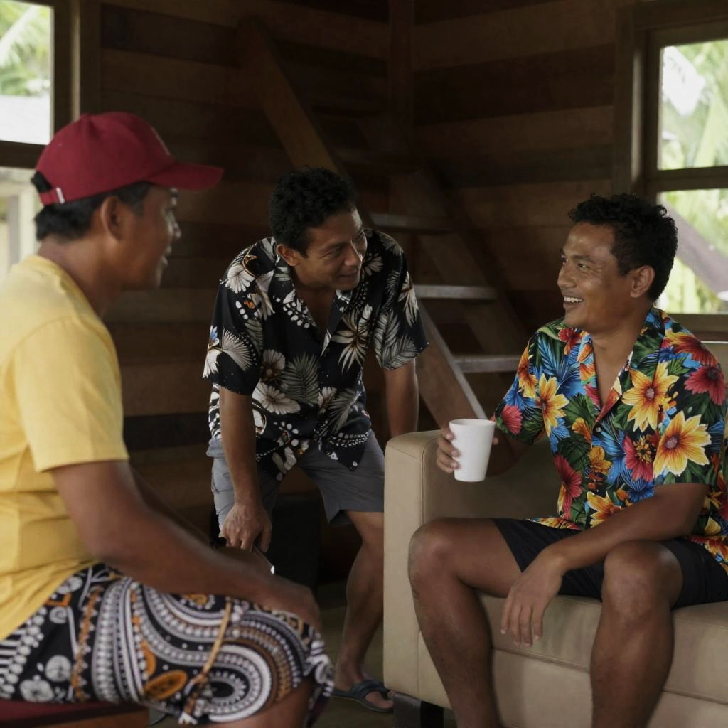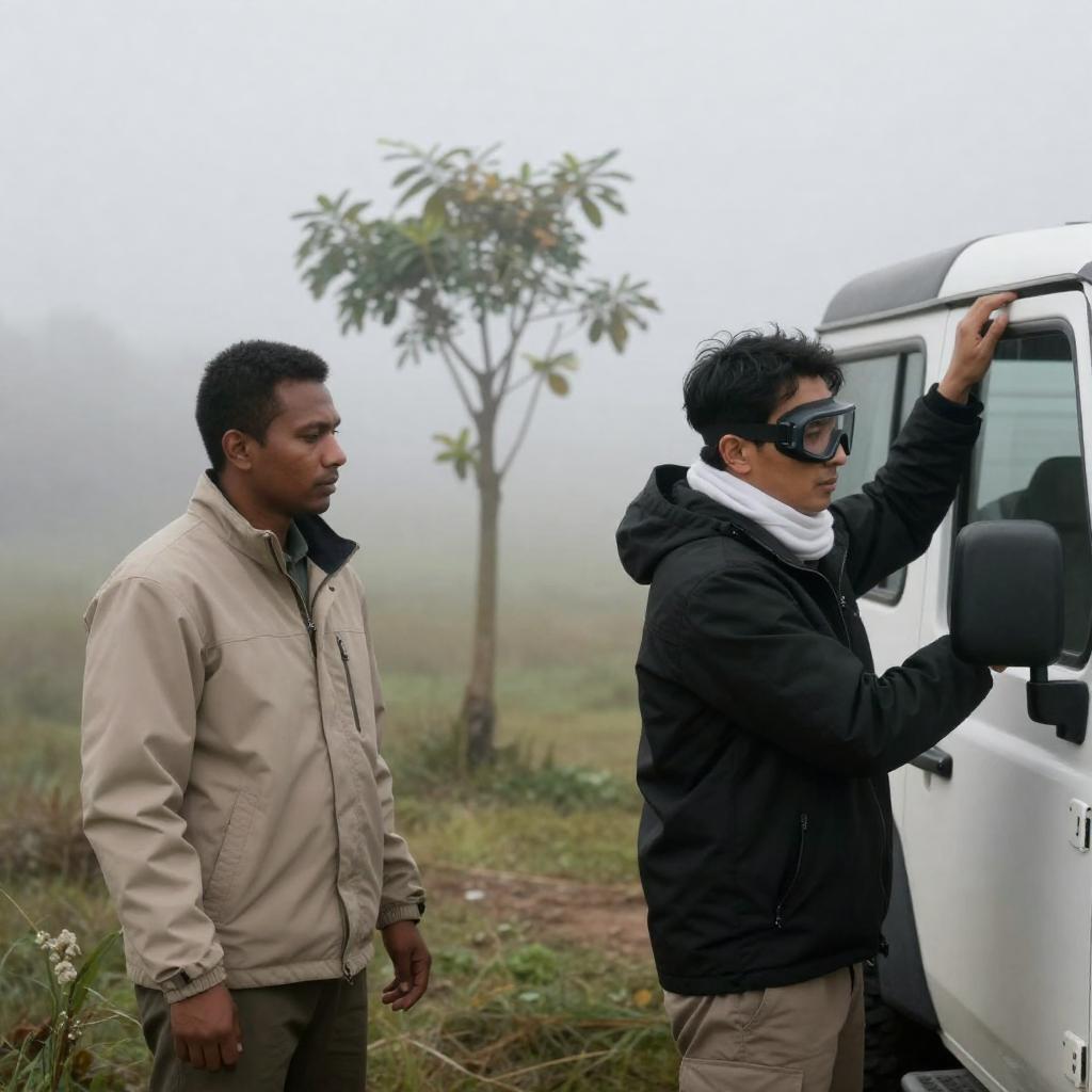 Photograph of two men outdoors in a foggy, rural setting. One man with dark skin, short black hair, and a beige jacket stands on the left, looking down. The other man, with medium brown skin, black hair, and wearing a black jacket, white scarf, and goggles, is in the right foreground, lifting a white off-road vehicle. A small tree and grassy hill are in the misty background.