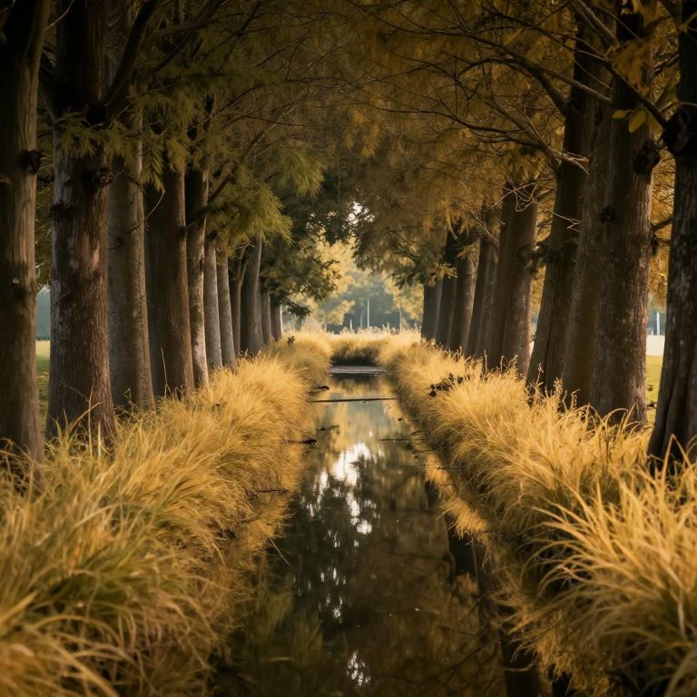 Photograph of a serene tree-lined path with tall, straight trees on both sides, their bark dark and textured. The path is flanked by golden-yellow grasses growing in the narrow strip between the trees and a reflective, narrow water channel running down the center. The water channel mirrors the trees and grasses, creating a symmetrical effect. Sunlight filters through the tree canopy, casting a warm, golden glow. The background is softly blurred, suggesting depth and distance. The overall scene evokes tranquility and natural beauty, with a focus on the contrast between the dark trees and the bright grasses.