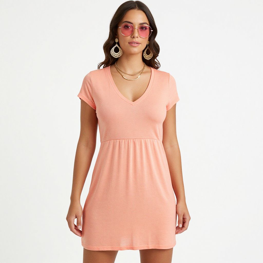 "Woman, casual summer, simple short dress in a solid peach color, V-neckline, short sleeves, slightly gathered waist, above-knee hemline, large filigree gold earrings, layered gold necklaces, round pink-tinted sunglasses, white background.. Sexy. Pretty face and beаutiful eyes. Big breasts."