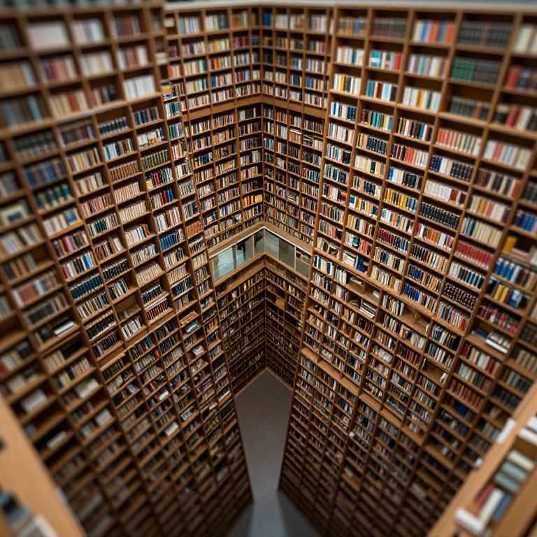 Compose an image depicting two colossal libraries intertwined in a surreal fusion, their endless shelves soaring upwards as if reaching for the heavens. Capture this scene from an overhead perspective that blurs the lines between architecture and observation, instilling a sense of bewilderment within the viewer. Delve into the intricate design of the book spines, combining reality with precise mathematical structures reminiscent of Escher's unique vision, inspiring both astonishment at the architectural marvel and curiosity regarding the enigmatic knowledge locked away in these labyrinthine libraries.