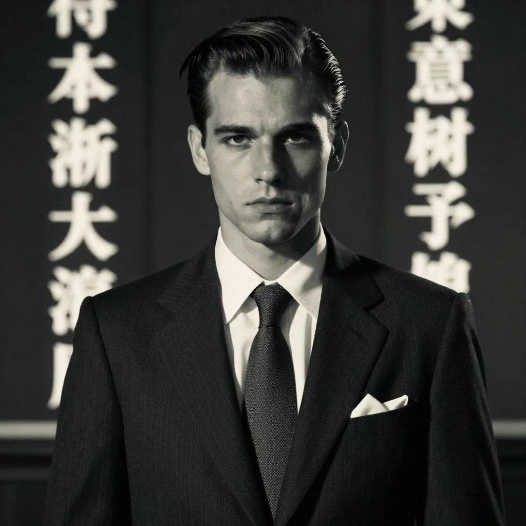 This is a black-and-white photograph of a handsome Caucasian man with slicked-back dark hair and intense eyes. He is wearing a dark pinstripe suit, white dress shirt, and black tie, with a white pocket square neatly folded. The background features blurred Japanese characters in bold white against a dark backdrop, adding a sense of mystery and formality. The man's expression is serious and focused, with even lighting highlighting his facial features and the texture of his suit. The overall composition is sophisticated and professional, evoking a sense of elegance and authority.