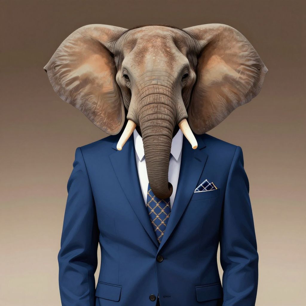Photograph of an anthropomorphic elephant in a navy blue suit, white shirt, patterned tie, and pocket square, with a gradient brown background.