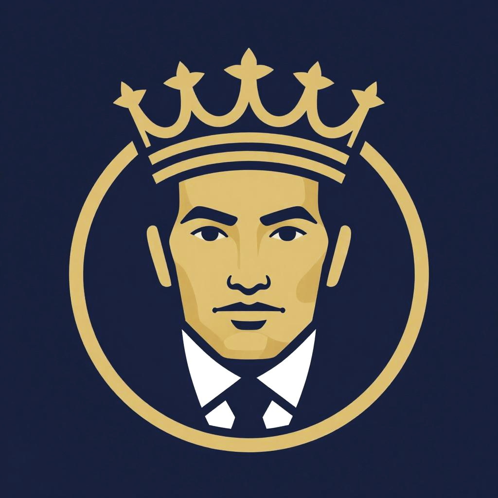 President icon representing leadership and authority, stylized face with confident expression, elegant crown emblem above, gold and navy hues, detailed vector graphics with sharp edges