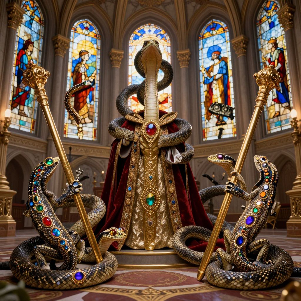 This is a highly detailed, digital CGI image of a grand cathedral interior with three large, colorful stained glass windows in the background. At the center, a regal figure in an ornate, gold-embellished robe is adorned with a large red gemstone. Three glittering, jeweled snakes with blue, green, and red gemstones coil around two golden scepters, which are positioned on either side. The snakes are intricately textured with scales and shine under the cathedral's light. The floor is patterned with red and gold tiles, and the architecture features tall, arched windows and ornate stone columns. The scene exudes a sense of opulence and mysticism.