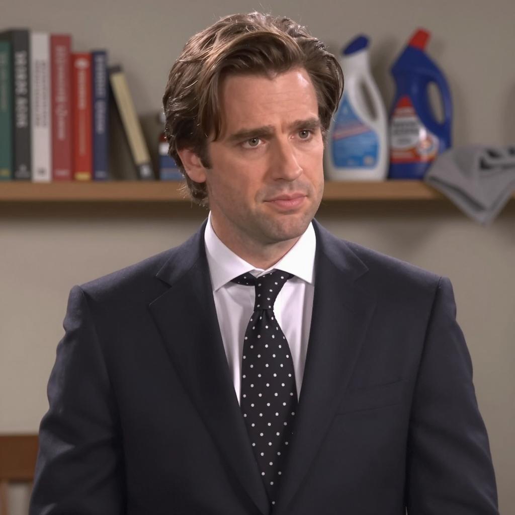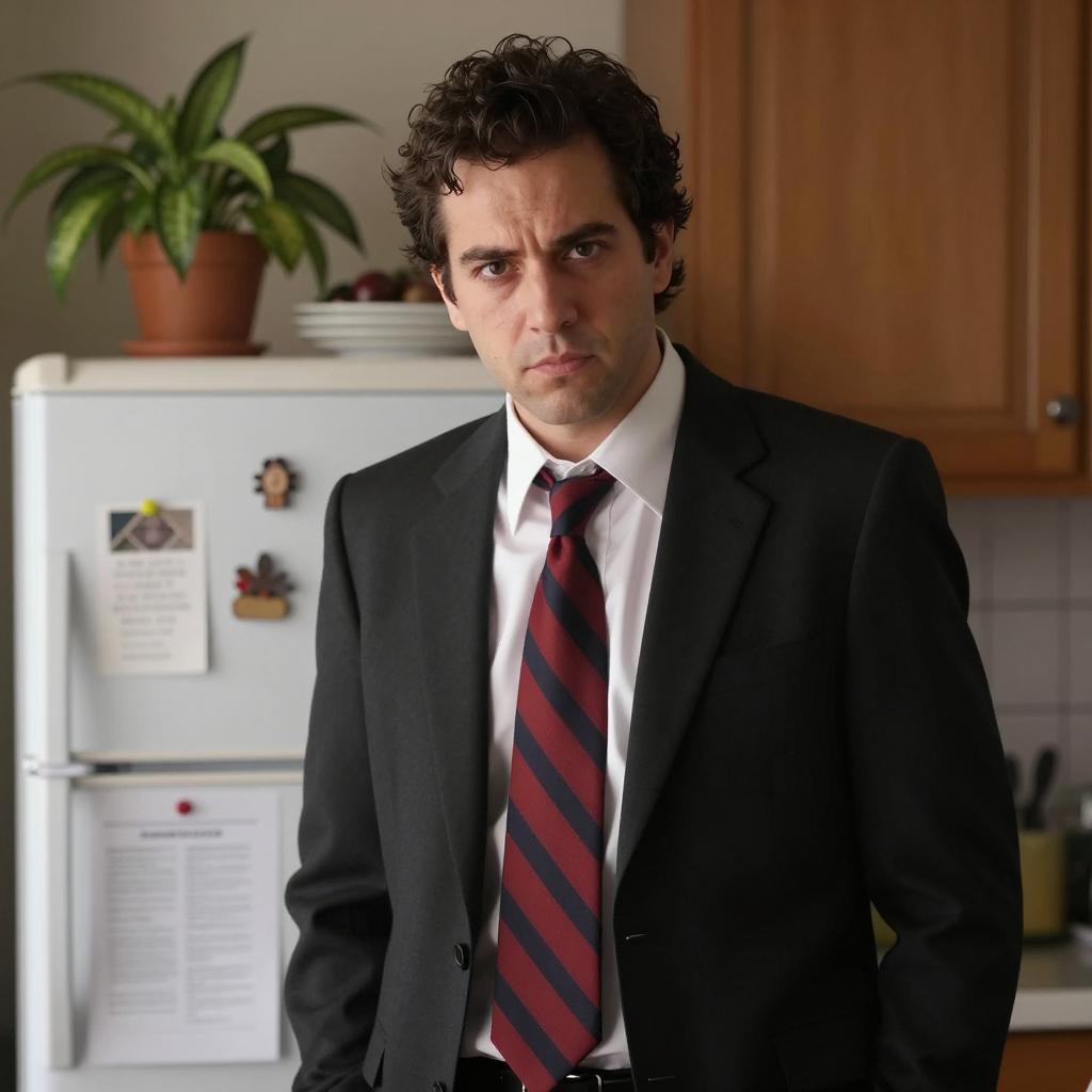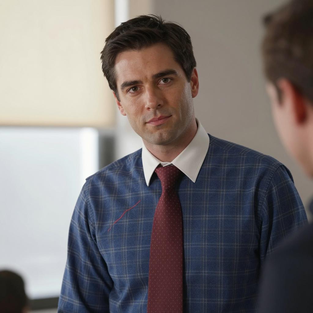 Man with short dark hair, blue plaid shirt, red patterned tie, and white collar, stands indoors, looking slightly to the side. Background includes blurred window and wall. Another person with brown hair is partially visible on the right. Light source from left. Document with red partially visible on man's left chest.