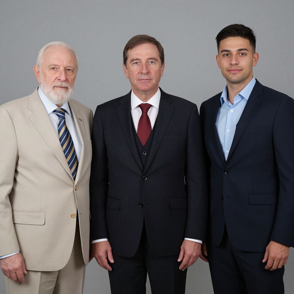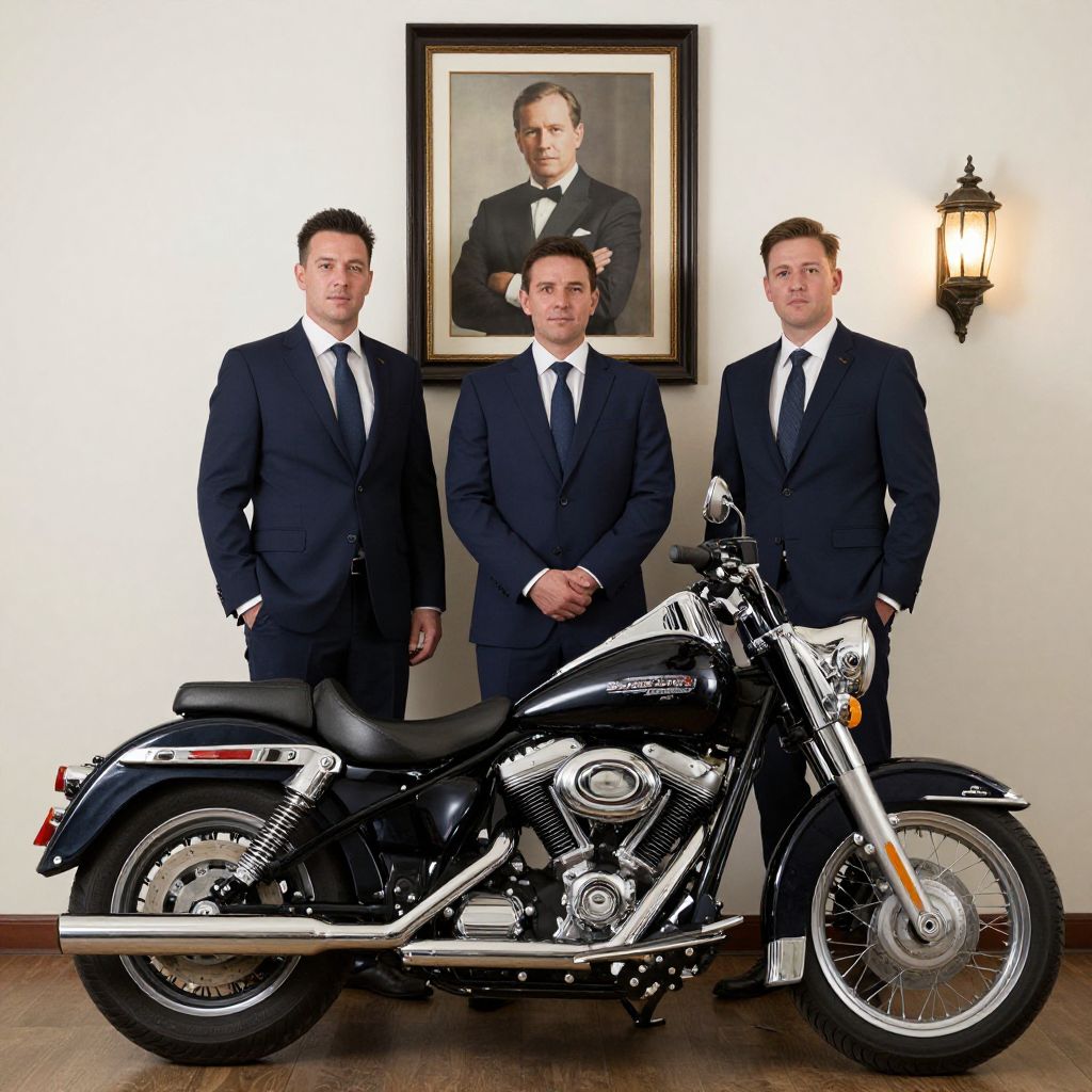 Three men in sharp navy suits stand confidently behind a classic Harley-Davidson motorcycle, with a framed portrait of a man in formal attire hanging above them and a vintage-style wall sconce to the right.