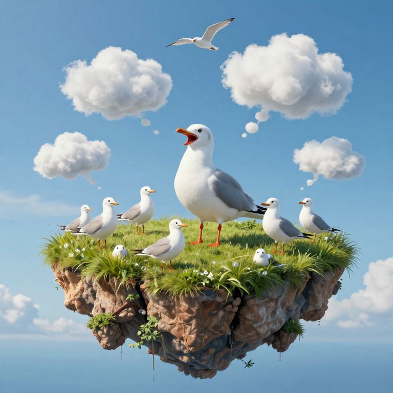 Digital illustration of a floating grassy island with seagulls, a blue sky, white clouds, and a flying seagull above.