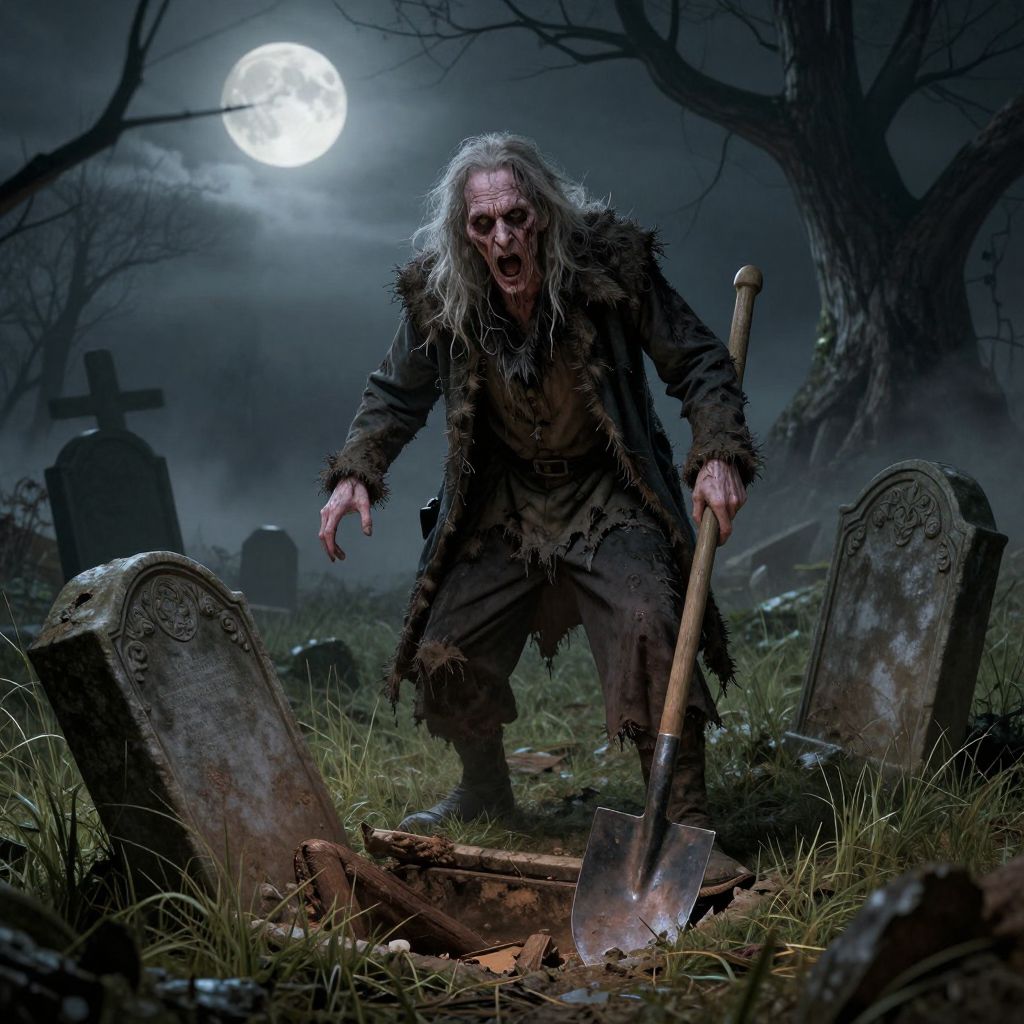 A dark, digital illustration of a menacing, disheveled old man with long, wild gray hair and pale, blood-stained skin. He wears tattered, dark clothing and stands in a haunted graveyard under a full moon. He grips a rusty shovel in his right hand, positioned over a freshly dug grave. Surrounding him are weathered gravestones, one with a cross, and leafless, twisted trees. The ground is grassy with scattered bones and dirt. The scene is eerie and atmospheric, with deep blues and grays dominating the color palette. The old man's expression is sinister and intense.