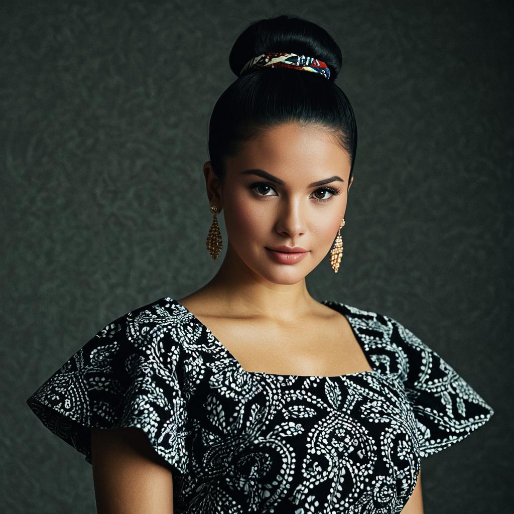 Portrait of a young woman with black hair styled in a high bun adorned with a colorful scarf. She is wearing a black and white patterned Ankara gown with short sleeves and gold dangling earrings. The woman has a smooth complexion and is looking directly at the camera against a dark textured background.