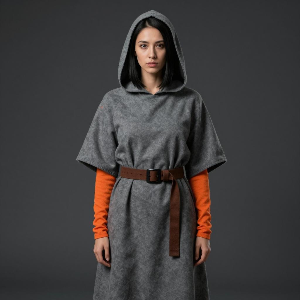 Undercover costume, photorealistic, portrait of woman, standing, dark background, gray hooded cloak, brown belt, orange arm warmers, serious expression, straight black hair, slightly parted lips, studio lighting, minimal shadows, realistic ures, fashion photography, casual style, front view, full body, no background objects, digital art, slightly worn clothing, soft lighting, realistic colors