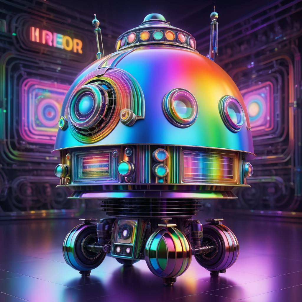 Ultra-realistic depiction of a retro robot featuring intricate details and symmetrical design, illuminated by volumetric rainbow lighting in a futuristic environment. The robot has a cylindrical body with numerous buttons and circular lights, large round eyes, and articulated claw hands. Rendered with high detail and vibrant color gradients using advanced 3D techniques.
