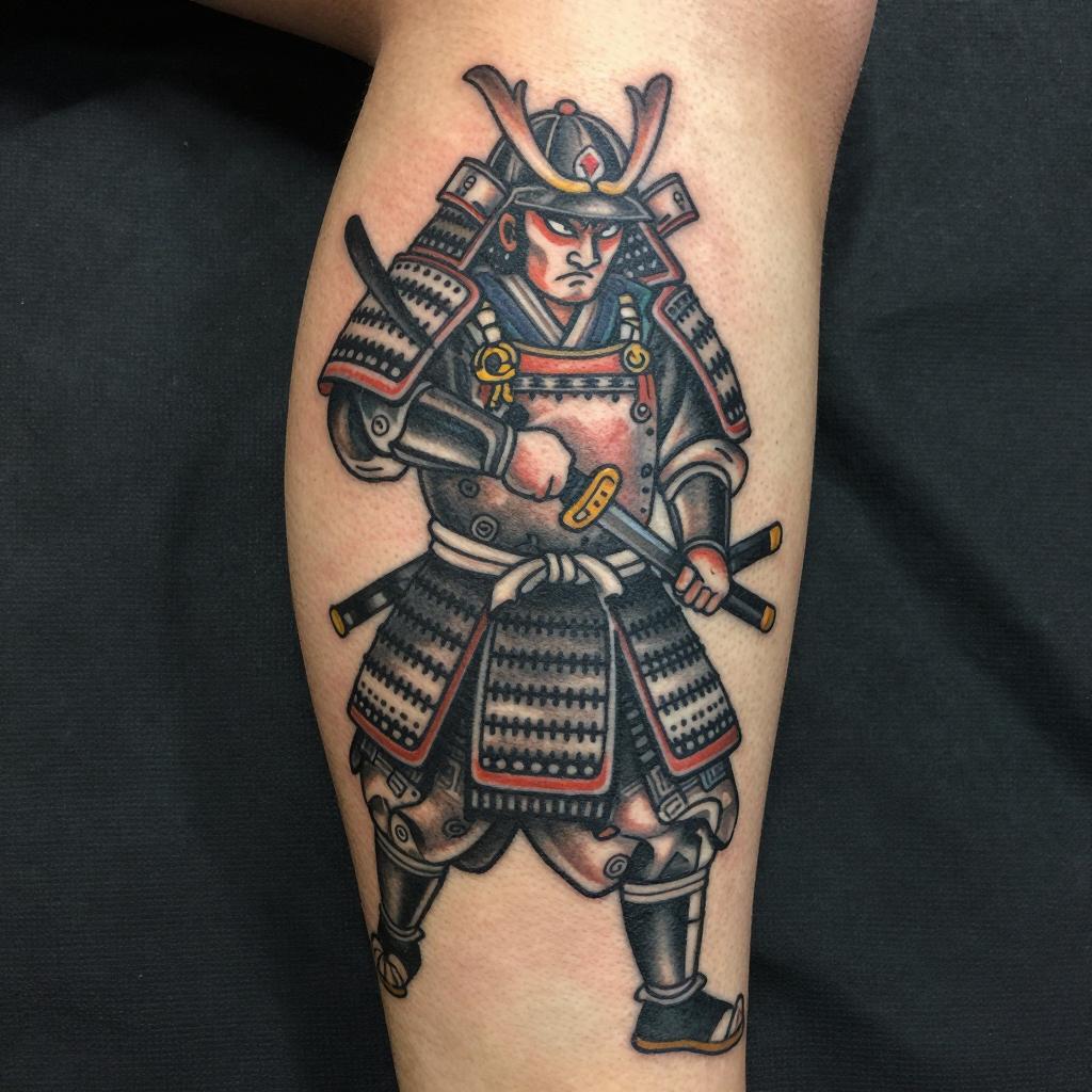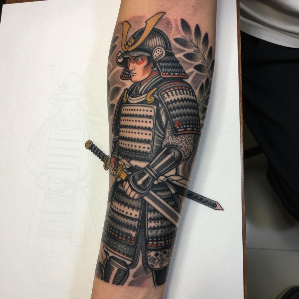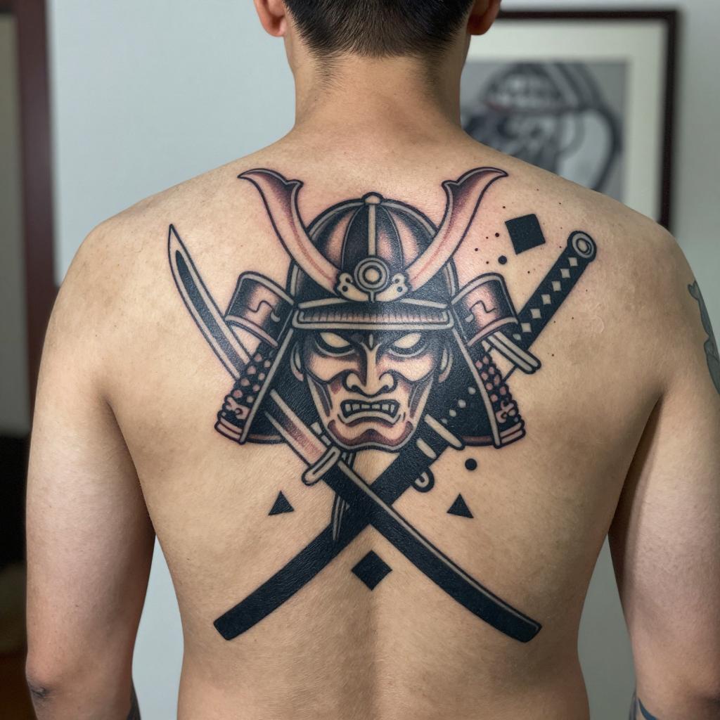 Photograph of a shirtless man with light skin. Detailed black ink tattoo on upper left arm. Tattoo features a stylized samurai helmet with cracks and splatters, crossed swords, and abstract lines. White towel around neck. Background is white wall. Upper body facing left.