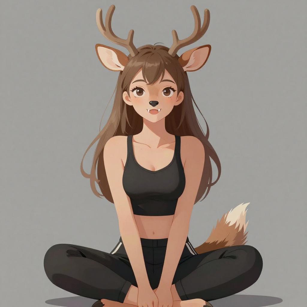 Digital illustration of a serene deer girl with soft brown hair, large movable deer ears, small antlers, and a fluffy tail. She has brown fur details on her face and body, medium bust, and visible navel. She wears a black sleeveless crop top and black pants with striped accents, sitting cross-legged on a grey background, smiling with slightly open mouth showing fangs.