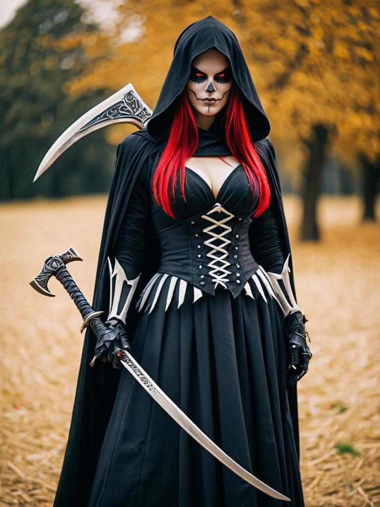 Photo-realistic cosplay photo of person standing in grim reaper costume. 1girl, red eyes, long hair, scythefull body shot. lifestyle stock photo, shallow depth of field, lifestyle stock photography, shallow depth of field, natural lighting, warm tones, soft background blur, vibrant colors, realistic textures