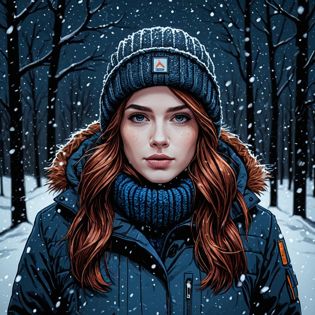 Attractive woman with red hair and green eyes in creamy beige winter gear out in the snow in the art style of Life is Strange, line drawing colored