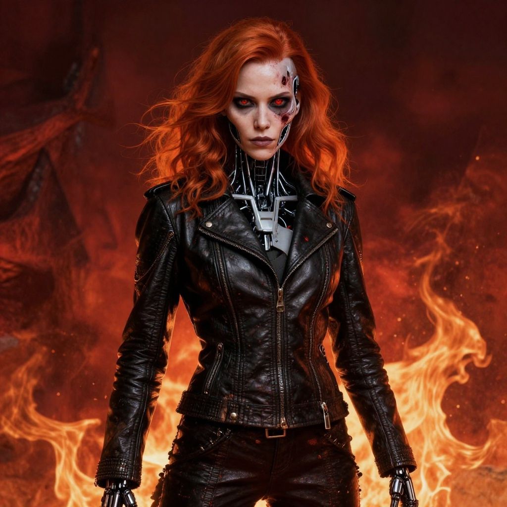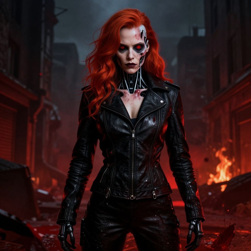 Terrifying Terminator girl, T-800, ultra realistic 8K, HDR, Cyborg, Leather black Jacket, sci-fy, Realistic Cyborg Red Eye, wavy red hair, broken bloody face, Half a cyborg face, Half of a cyborg skeleton face, cyborg sinister by Greg Rutkowski, red as complementary colours, fire, Terrifying Sadie Sink as Terminator girl, Photograph Taken on Nikon D750, Intricate, Elegant, Digital Illustration, Scenic, full body, HyperRealistic, HyperDetailed, Unreal Engine, CryEngine, Octane Render, Attractive, Atrractive bust girl, attractive 20 years old woman, very gory