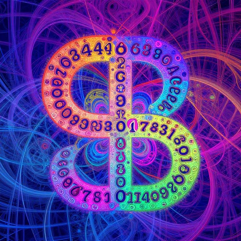Zahl, abstract art of interconnected numerical symbols forming a complex pattern on a vibrant digital canvas, luminous colors, fractal design elements, high resolution, modern minimalism