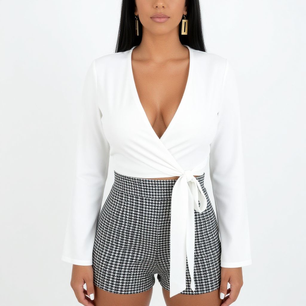 "Woman, contemporary chic, white wrap-style top with a deep V-neckline and long sleeves, front tie at the waist, paired with high-waisted shorts in a black and white houndstooth pattern, gold statement earrings, minimal makeup, white nails, plain white background.. Sexy. Pretty face and beаutiful eyes. Big breasts."