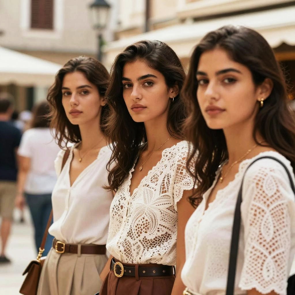 Photograph of three young women with olive skin and dark brown hair, standing closely together in a sunlit urban street. They wear white, lace-patterned, short-sleeve tops, with the middle woman's top having a deep V-neck. The left woman has a white blouse with a brown belt, beige pants, and a black shoulder bag. The right woman's top has a more intricate lace pattern, and she carries a black strap bag. The background shows a blurred street with people and buildings. The women have serious, focused expressions, and the overall mood is stylish and urban.